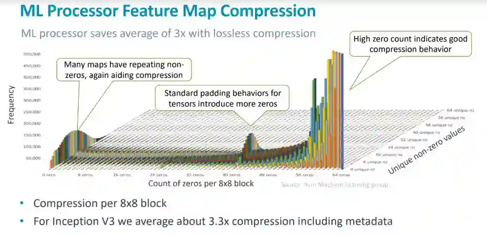 使用机器学习处理器特征映射压缩技术可以获得更高的效率,这些技术听起来和DeePhi在CNN压缩上的作用类似。