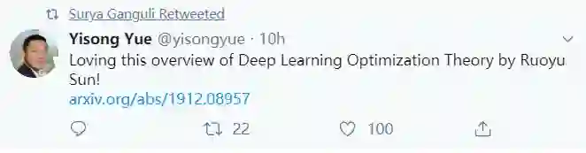深度学习理论是当下研究的热点之一。最近来自UIUC的助理教授孙若愚撰写了一篇关于深度学习优化的综述论文《Optimization for deep learning: theory and algorithms》,共60页257篇文献,概述了神经网络的优化算法和训练理论,并得到众多大佬的推荐,比如模仿学习带头人加州理工Yisong Yue,欢迎大家阅览,需要一番数学理论功底,方能扛过。
