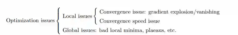 图1: 对神经网络训练的几个主要元素的理论解读。它们对算法收敛的三个方面有影响:使收敛成为可能、更快的收敛和更好的全局解。这三个方面有一定的联系,因此上述分类只是一个粗略的分类。请注意,对一些重要元素(特别是神经网络架构)的理论理解还非常欠缺,因此在该图中被省略了。还有一些重要理论方面(比如泛化能力和表示能力),在这个图中被省略了。