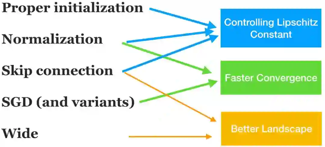 在上述诸多元素中, 哪些元素是必要的? 目前我们已经了解了一些元素的作用,包括初始化策略、归一化方法、跳跃连接、过参数化 (大宽度)和SGD,如图1所示。我们将它们对优化算法的影响大致分为三部分: 控制Lipschitz常数(以使算法收敛)、更快的收敛速度和更好的函数全局性质 (landscape)。还有许多其他的元素是很难理解的,尤其是神经架构。话说回来,要理解这个复杂系统的每个部分是几乎不可能的,而这个领域目前的研究已经可以提供一些有用的理解和启发。