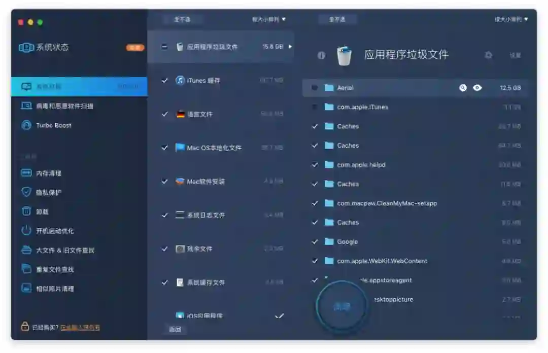 在维护工具中的各项功能中,清理垃圾应该是最基础也是用户最常用的一项了。特别是对于 256GB 容量及以下的 Mac 而言,每次清理系统垃圾都可以空出相当可观的空闲容量。MacBooster 认定的系统垃圾主要包括应用程序缓存、iTunes 缓存、语言文件等,这几项基本上占了垃圾文件的 90%。