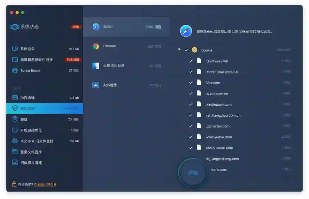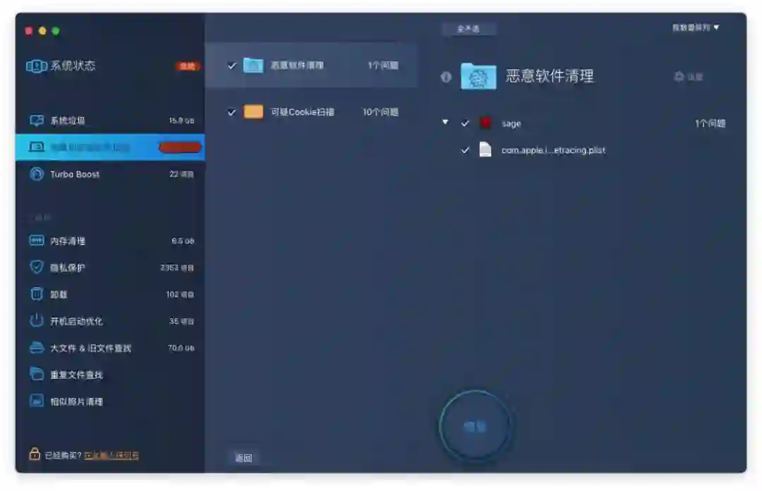 Mac 用户几乎不会 Mac 病毒的威胁过分担忧,诚然,相对于 Windows 系统,Mac 系统的安全性更让人放心。在「病毒和恶意软件扫描」中,MacBooster 会分析 Mac 中存在的可疑软件和 Cookie,防止你在 Mac 上的各类行为被恶意追踪。