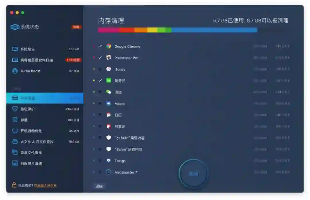 工具箱首位的功能就是内存清理。它明了地显示了 Mac 上运行的应用当前占用的内存,从大到小,不论是前台正在使用还是后台保持,所有应用都在这里。吃内存大户 Chrome、视频应用等等都是占用内存的熟面孔,对于这些应用,我们可以直接在 MacBooster 里勾选它们,一键关闭,释放内存。