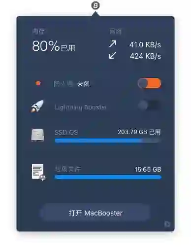 MacBooster 在 Mac 菜单栏会常驻一个小窗口,简要显示当前 Mac 的状态,包括内存占用、网络测速等。我们可以一键释放内存或深度清理文件。打开 Lightning Booster 会使 MacBooster 进行一次系统清理,来快速提高 Mac 性能。我们不必再进入应用,直接在菜单栏就可以进行系统优化。