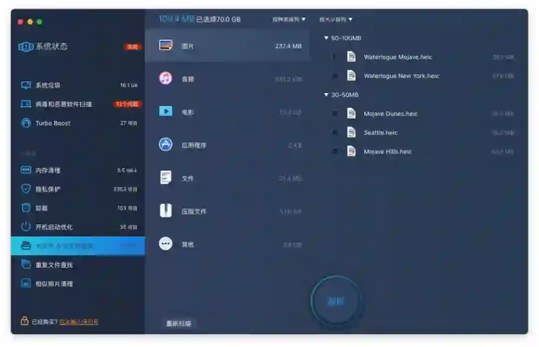 MacBooster 的文件查找功能包括了大文件、旧文件、重复文件、相似照片清理四部分。及时清理那些不常用的视频、图片,也能给 Mac 带来可观的存储空间;查找那些重复或相似的图片,按需保留,也能可以省下大量空间。不过删除它们之前,我们也要检查这些文件的重要性,避免错误删除。
