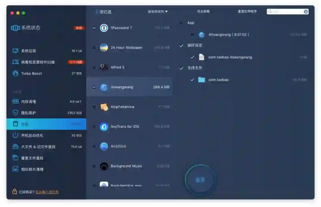 顾名思义,卸载功能可以把 Mac 上安装的应用卸载干净,连同和它相关的偏好设定文件、支持文件等都移除。MacBooster 还能把应用重置,也就是把应用恢复到刚刚安装好时的状态。