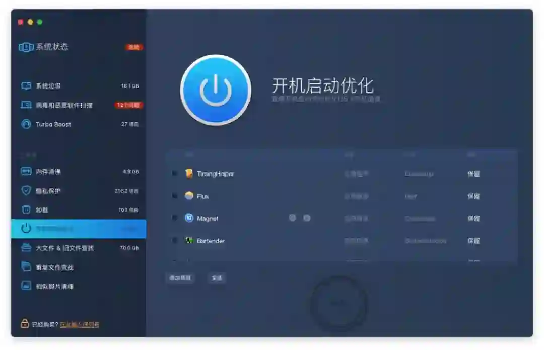 开机启动项优化其实是针对系统偏好设置中的登录项管理做了可视化。一步到位,要比在系统偏好设置里翻找便捷许多。