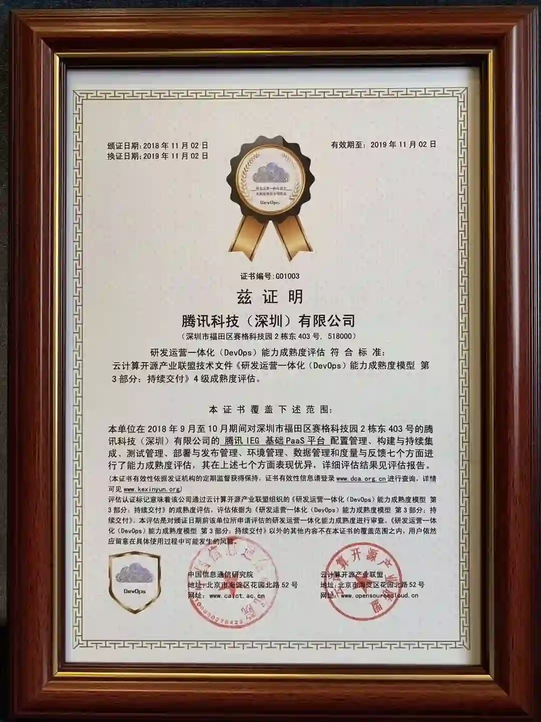2018年11月2日在深圳召开的 DevOps 国际峰会(DOIS)· 深圳站上,腾讯互动娱乐事业群(IEG)的基础 PaaS 平台获得由工信部中国信息通信研究院主持颁发的《研发运营一体化(DevOps)能力成熟度模型》(即 DevOps 标准)评估证书,证书编号为 G01003。