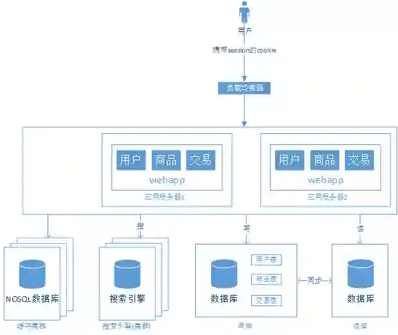 网站的初期,我们经常会在单机上跑我们所有的程序和软件。此时我们使用一个容器,如tomcat、jetty、jboos,然后直接使用JSP/servlet技术,或者使用一些开源的框架如maven+spring+struct+hibernate、maven+spring+springmvc+mybatis;最后再选择一个数据库管理系统来存储数据,如mysql、sqlserver、oracle,然后通过JDBC进行数据库的连接和操作。