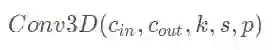 来描述一个卷积中间层,Conv3D表示是三维卷积,cin,cout分别表示输入和输出的通道数,k是卷积核的大小,它是一个向量,对于三维卷积而言,卷积核的大小为(k,k,k);s即stride,卷积操作的步长;p即padding,填充的尺寸。