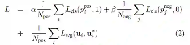 分别表示神经网络的正样本输出的标注框和真实标注框。损失函数的前两项表示对于正样本输出和负样本输出的分类损失(已经进行了正规化),其中