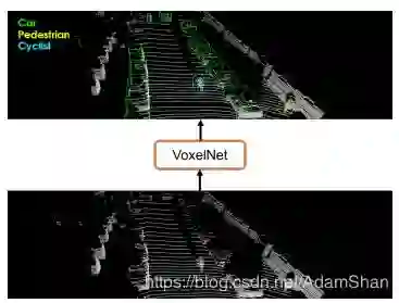 VoxelNet是一个端到端的点云目标检测网络,和图像视觉中的深度学习方法一样,其不需要人为设计的目标特征,通过大量的训练数据集,即可学习到对应的目标的特征,从而检测出点云中的目标,如下:
