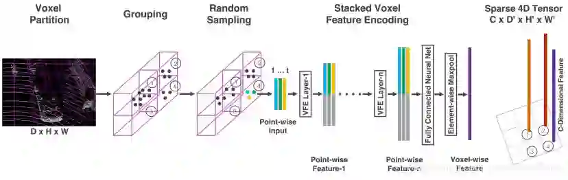 特征学习网络的结构如下图所示,包括体素分块(Voxel Partition),点云分组(Grouping),随机采样(Random Sampling),多层的体素特征编码(Stacked Voxel Feature Encoding),稀疏张量表示(Sparse Tensor Representation)等步骤,具体来说: