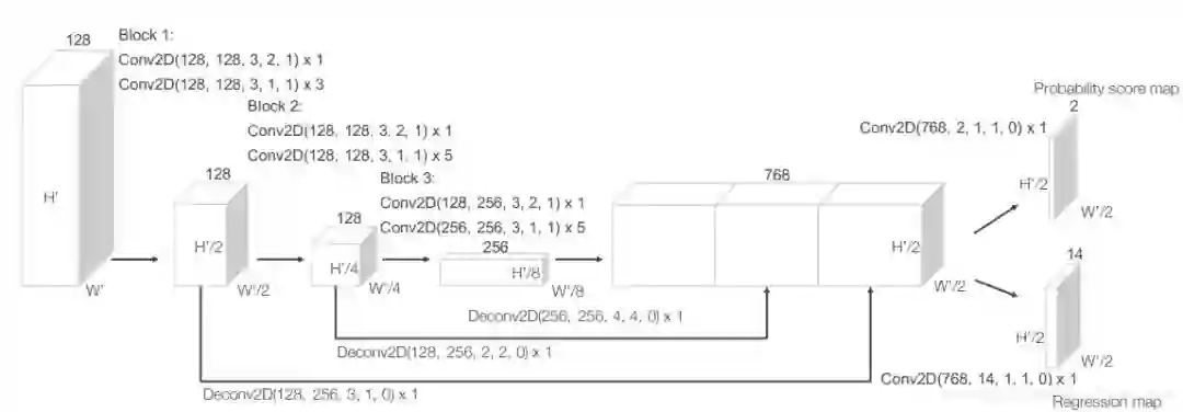 对于具体的车辆检测问题,我们取沿着Lidar坐标系的(Z,Y,X) (Z,Y,X)(Z,Y,X)方向取[−3,1]×[−40,40]×[0,70.4] [−3, 1] × [−40, 40] × [0, 70.4][−3,1]×[−40,40]×[0,70.4]立方体(单位为米)作为输入点云,取体素格的大小为: