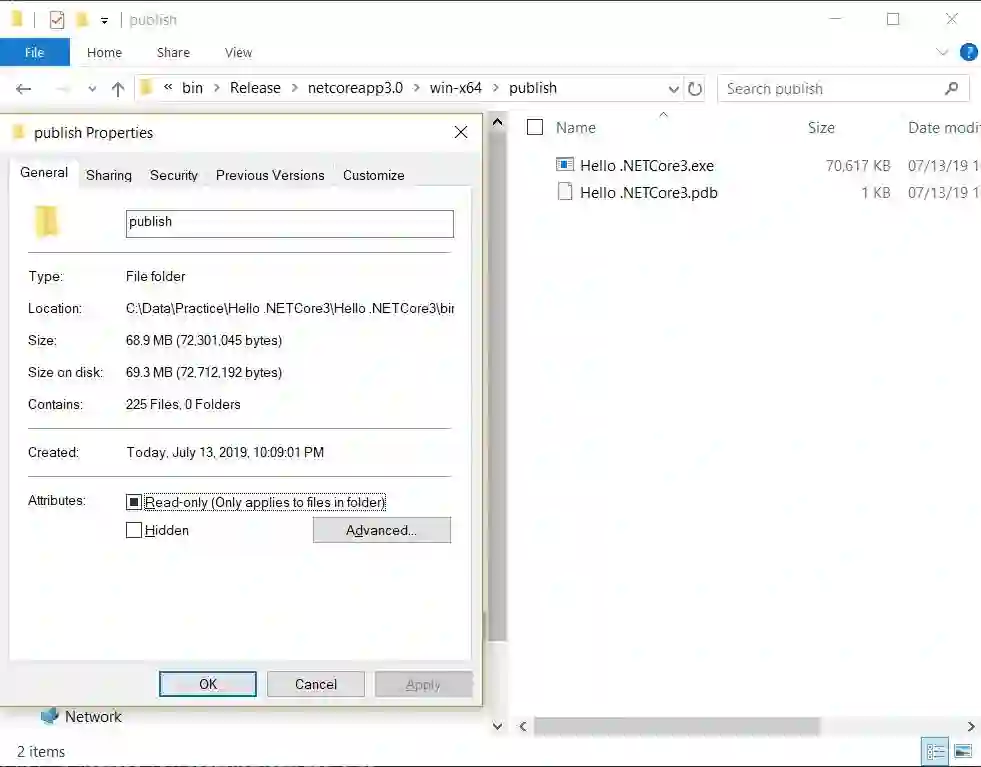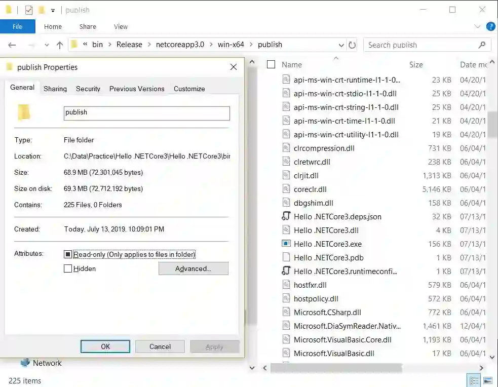 上面的命令执行之后会在创建的发布文件夹中包含 self-contained 可执行程序所需的所有文件,文件数大概有 100 个左右,如果想要在目标计算机上运行这个应用程序,那就需要复制这个发布文件夹内所有文件,似乎并不是那么方便,而且这些文件占用的空间也不算小。