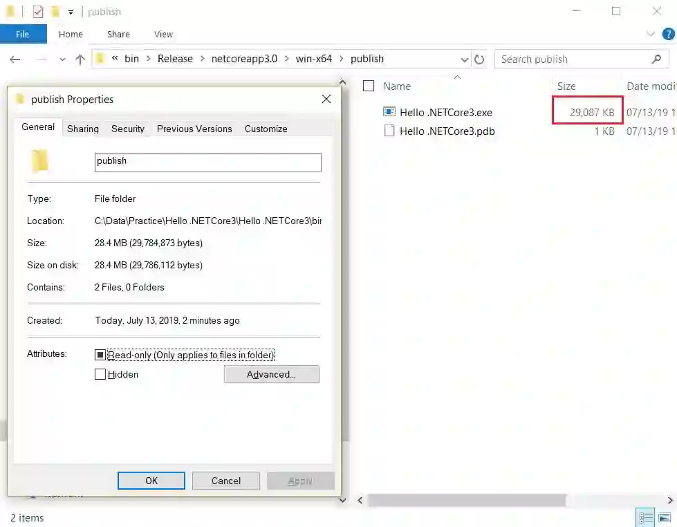使用上面的两个命令后,您会发现,单体可执行文件的尺寸只有 29MB 了。对于简单的控制台应用程序来说,它仍然有点儿大,但请注意,这是一个包含了 .NET Core 运行时的 self-contained 应用程序。