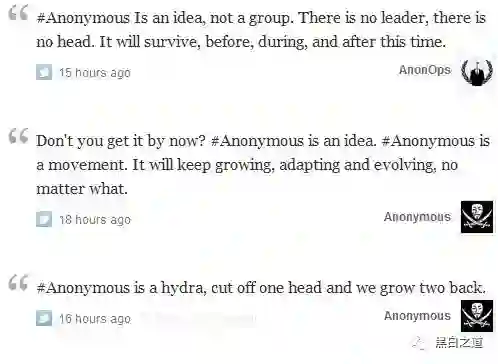 而即便LulzSec在去年夏天之后就已经偃旗息鼓,Sabu仍然是黑客界的偶像之一,此次他被揭发为叛徒对Anonymous来说无疑是一次巨大的打击,但他们并不示弱,许多Anonymous成员纷纷在推特上发推反击(上图),“Anonymous是一种态度,而不是一个固定组织,我们没有领袖,也没有头儿,我们会顽强生存下去,从前,现在和将来都是。”“Anonymous是九头蛇,砍掉我们一个头,我们就长两个回来。”
