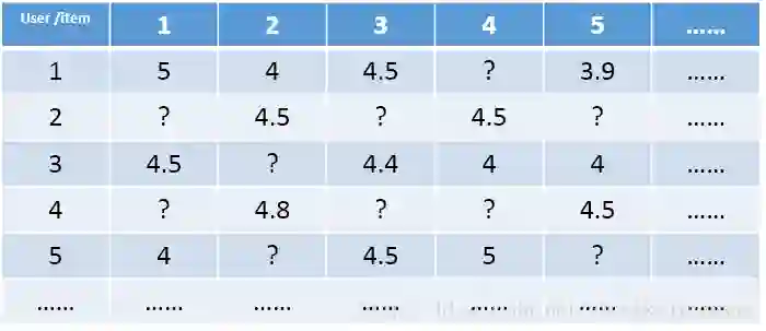 上图即为评分矩阵的一个例子。其中的?表示用户还没有对物品做出评价,而推荐系统最终的目标就是对于任意一个用户,预测出所有未评分物品的分值,并按分值从高到低的顺序将对应的物品推荐给用户。