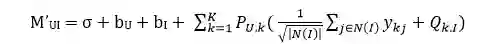 又比如某个物品非常精美,所有用户都会给出较高的分数,这也仅仅与物品自身有关。因此,只通过用户与物品之间的联系来预测评分是不合理的,同时也需要考虑到用户和物品自身的属性。于是,评分预测的公式也需要进行修正。不妨设整个评分矩阵的平均分为σ,用户U和物品I的偏置分别为和