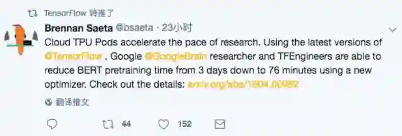 不过在 BERT 原论文中,训练 BERT-Large 使用了 64 块 TPU 芯片(16 Cloud TPU),它需要花四天时间完成训练。