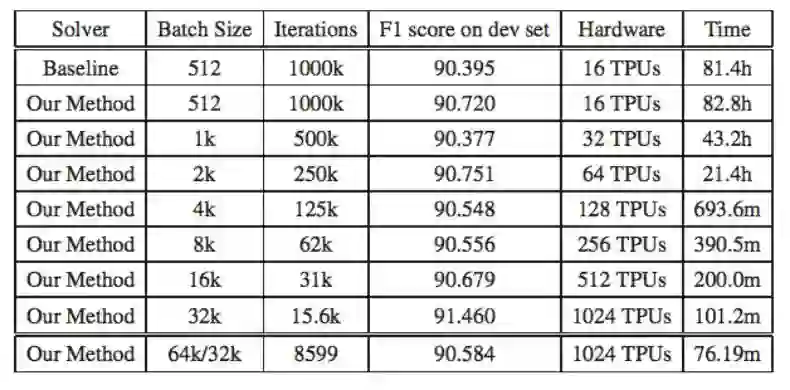 该研究中,研究者使用 BERT 作者提供的数据集和基线模型,仅改变了优化器。使用新型优化器 LAMB 后,研究者以 32768 的批量大小进行了 15625 次迭代,得到了 91.460 的 F1 分数(用于序列长度 128 的迭代有 14063 次,用于序列长度 512 的迭代有 1562 次)。研究者将 BERT 训练时间从 3 天缩短到大约 100 分钟。