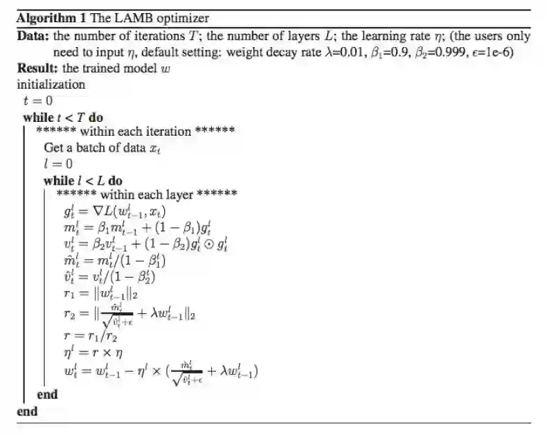 BERT 基线模型的训练使用 Adam with weight decay(Adam 优化器的变体)作为优化器 [15]。另一个成功用于大批量卷积神经网络训练的自适应优化器是 LARS [21]。这些优化器启发了研究者提出用于大批量 BERT 训练的新型优化器 LAMB。LAMB 优化器详见算法 1。
