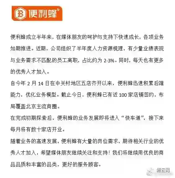 便利蜂被曝在8月底开掉了大约50人左右的员工,占便利蜂总部员工总数的近十分之一。对此,便利蜂在官方微博回应称,离职员工占比约为2-3%,因业绩表现与业务需求不匹配所致。此外,便利蜂的业务发展即将进入“快车道”,接下来每月将有数十家店开业。