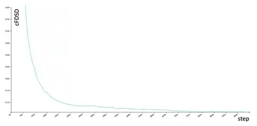 本文提出的模型在训练过程中非常稳定,主观的样本质量随着训练过程逐步上升,定量的评估指标也随之逐渐下降,并且直到训练到一百万迭代次数,也没有遭遇GAN经常会遇到的模型崩溃问题。