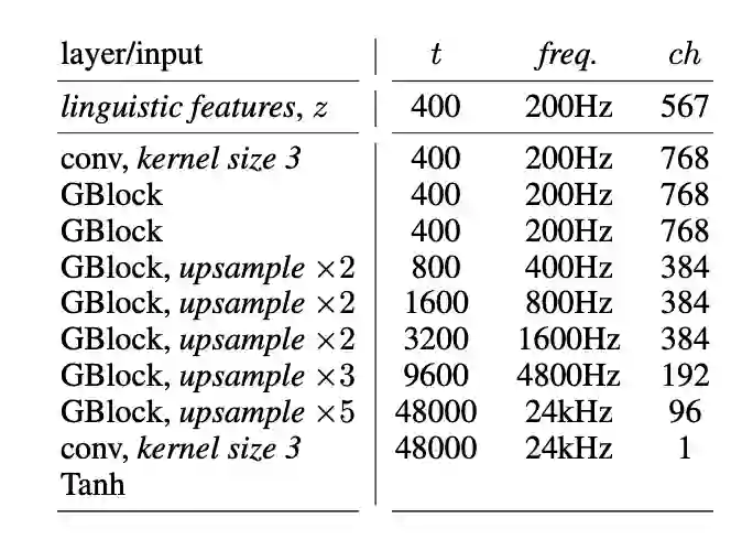 G的输入是语言和音调信息200Hz的序列,输出是24kHz的原始波形图。生成器由七个块组成(GBlocks),其中每个块是两个残差块的堆积。