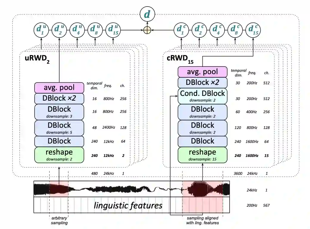 相对于单个判别器,本文集成了随机窗口判别器(Random Window Discriminators, RWDs)此判别器对真实和生成样本的随机子采样片段进行操作。集成操作可以使本文可以对语音进行模型的逐个评估,并且可以通过两个参数的笛卡尔积获得,这两个参数分别是1)随机窗口的大小2)判别器是否捕捉了语言和音调信息。由于采用了较短的随机窗口,集成判别器可以获得比传统判别器梗块的训练效果。