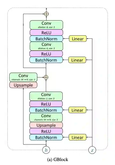 其中,包含块的判别器(discriminator consists of block, DBlocks)和生成器中使用到的GBlock相似,区别就在于没有批标准化。