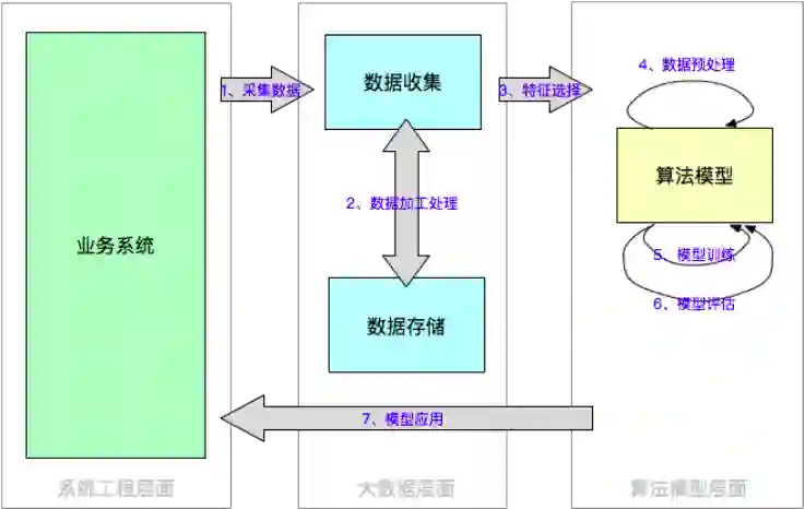 总结一下,经过数据采集、加工处理、特征选择、数据预处理、模型训练、模型评估、模型应用几个环节,数据跨过业务系统、数据平台、算法模型三个系统,形成一个闭环,最终又应用到业务系统中,这就构成了整个AI架构的核心。