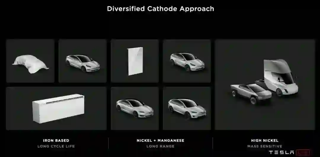 这是 2020 年特斯拉电池日 PPT 的其中一页,讲的是特斯拉未来几年电池正极材料的选型取向:铁基、镍+锰、高镍配方。磷酸铁锂正极属于最左侧的“铁基”,这种循环寿命长、原材料成本更低的正极材料,将被特斯拉用于入门版 Model 3/Y、工业级储能方案和……等等,那个被盖着的东西是什么?