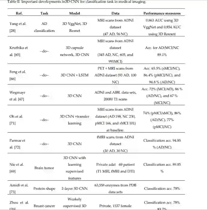 机器学习,图形处理技术和医学成像数据的可用性的快速发展导致在医学领域深度学习模型的使用迅速增加。基于卷积神经网络(CNN)的体系结构的快速发展加剧了这种情况,医学成像社区采用了该体系结构来帮助临床医生进行疾病诊断。自2012年AlexNet取得巨大成功以来,CNNs越来越多地用于医学图像分析,以提高人类临床医生的效率。近年来,三维(3D)CNNs已用于医学图像分析。在本文中,追溯了3D CNN如何从其机器学习根源发展的历史,对3D CNN进行了简要的数学描述,并在将医学图像输入3D CNNs之前对其进行了必要的预处理。文中还回顾了使用3D CNNs(及其变体)在不同医学领域(例如分类,分割,检测和定位)的3D医学成像分析领域的重要研究。通过讨论与在医学成像领域中使用3D CNNs相关的挑战(以及通常使用深度学习模型)以及该领域可能的未来趋势来得出结论。