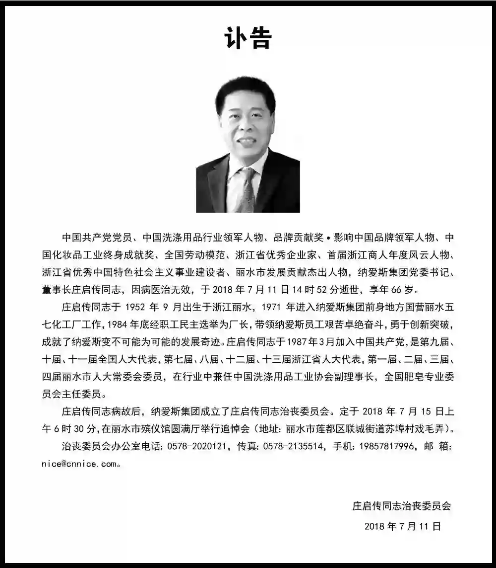7月11日晚间,纳爱斯集团官网发布讣告:纳爱斯集团党委书记、董事长庄启传先生因病医治无效,于7月11日14时52分逝世,享年66岁。