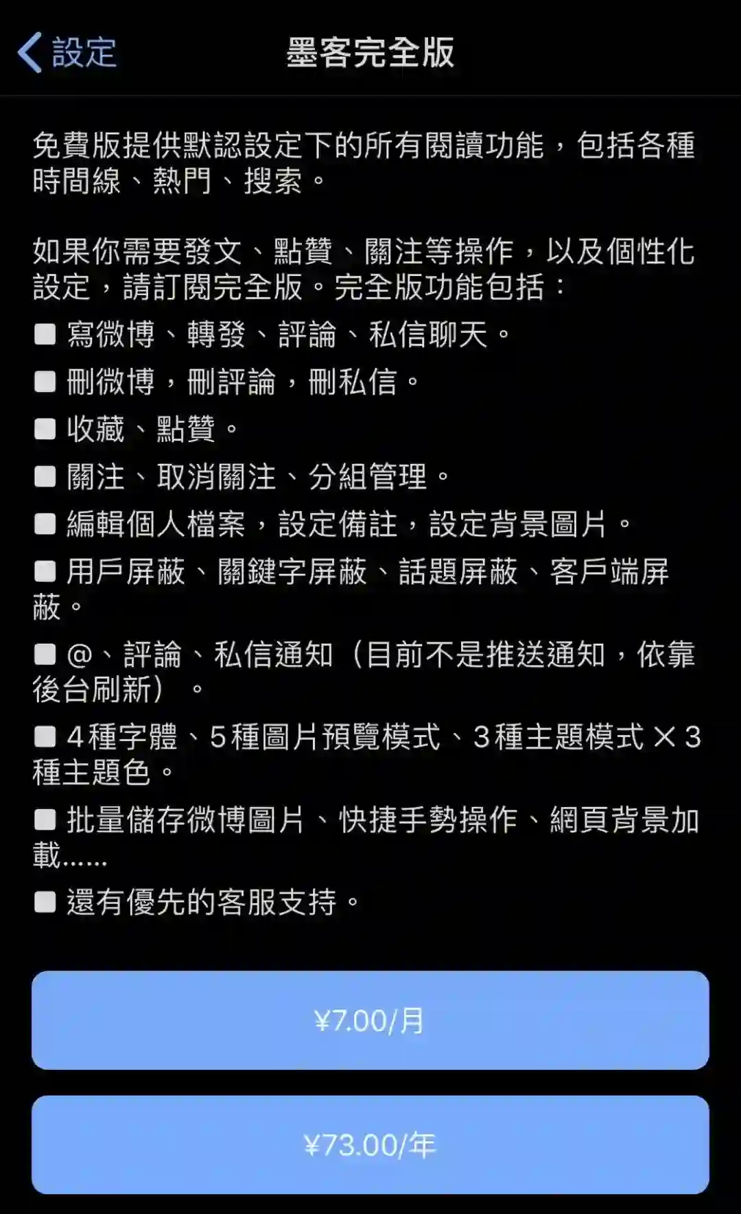 免费版本只能作为微博阅读器浏览微博,发布和删除微博以及评论、关注和取消关注用户等功能需要订阅才能使用。