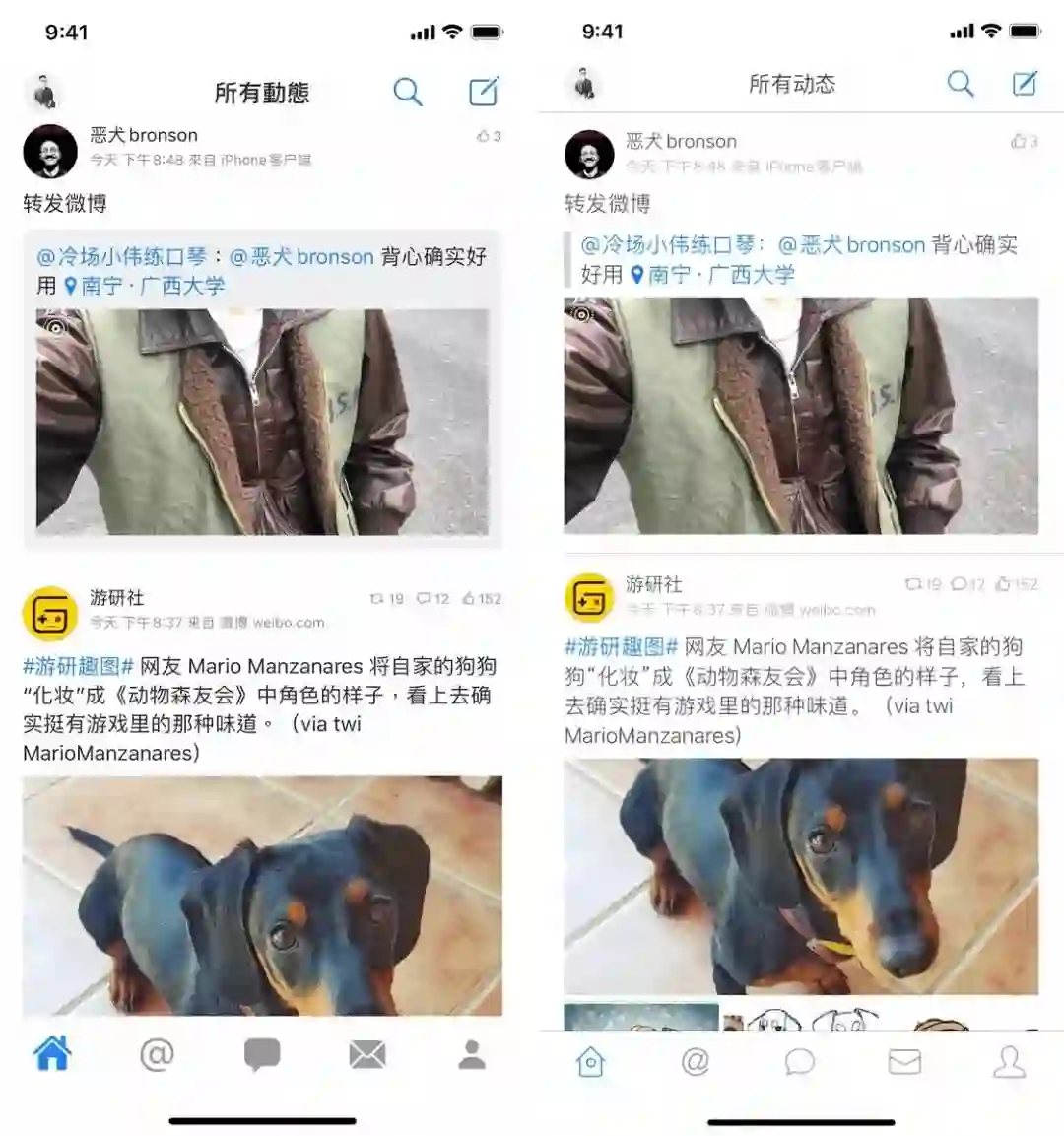 与单击顶部工具栏的逻辑类似,如果我们在单击底部工具之后微博时间线下滚的过程中,路过了新旧微博的断层内容或者之前记录过的阅读位置,应用都会停止滚动以便我们能够继续阅读。