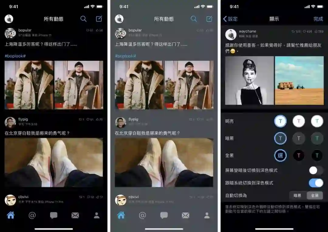 墨客 3 在原有「暗黑」主题的基础上,增加了与 iOS 13 系统深色模式一致的「全黑」主题;