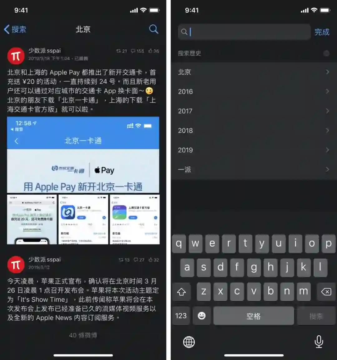 在之前版本中,我们只能在微博用户主页搜索应用已经在本地加载好的内容,在新版本中,我们可以搜索用户的全部历史微博,不需要再到官方客户端或者网页中进行这项操作了;