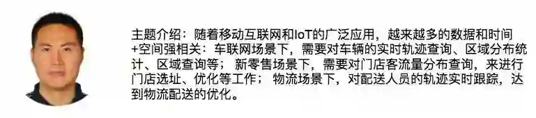 宋子辉(花名:毅鹏) ,阿里云数据库产品事业部高级技术专家。专注于时空数据库研发,曾在中国学院遥感与数字地球研究所工作10年,在GIS领域有15年的研发经验;主持过多个国家科研课题,负责过空间数据引擎、地址匹配引擎、空间大数据平台等系统开发