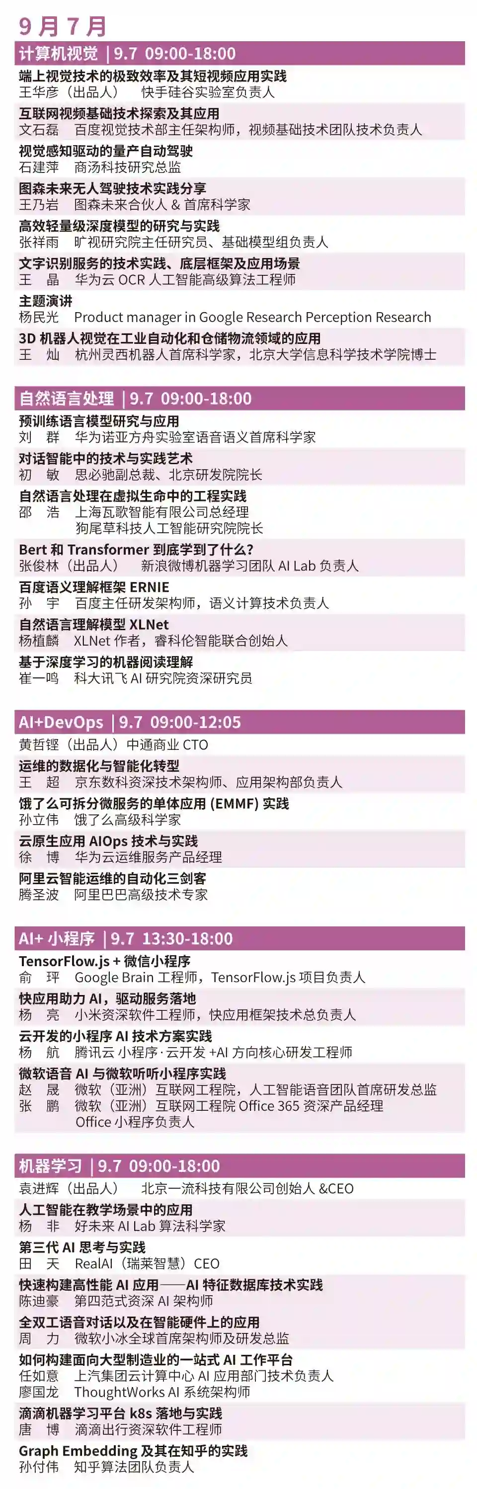 2019 年 9 月 6-7 日 是两日精彩大会。大会组委会不仅策划了嘉宾阵容强大的首日 Keynote,还专门为国内开发者设立了九大技术论坛,探秘机器学习、计算机视觉、自然语言处理、知识图谱、推荐系统、5G驱动 AIoT、AI 开源、AI+小程序和 AI+Devops 等核心技术与前沿趋势。从论坛定位、议题内容、Panel 环节的精心策划与严格把控,打造技术纯享论坛,为开发者筹备内容优质、干货满满的技术交流盛会。