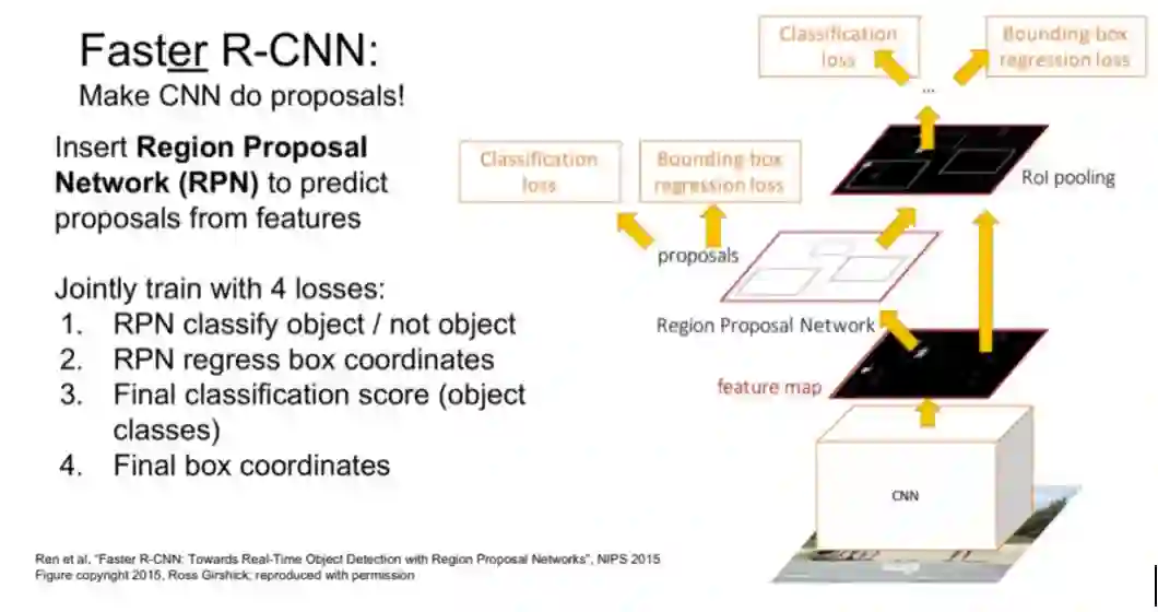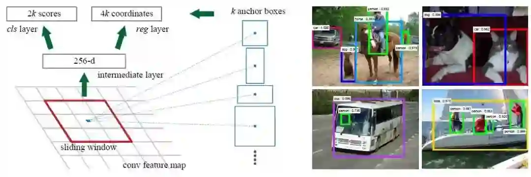 Faster-RCNN 为了改进这点提出了 RPN 结构,RPN 可以在 Feature Map 的每个位置提取很多不同尺寸、不同形状的候选框,也叫 Anchor。每个 Anchor 后会跟一个二值分类,来判断这个 Anchor 是否是背景,并接一个回归对位置进行微调。具体的类别和位置在网络尾端还会进一步调整。至此,整个目标检测过程都可以实现端到端的进行训练。
