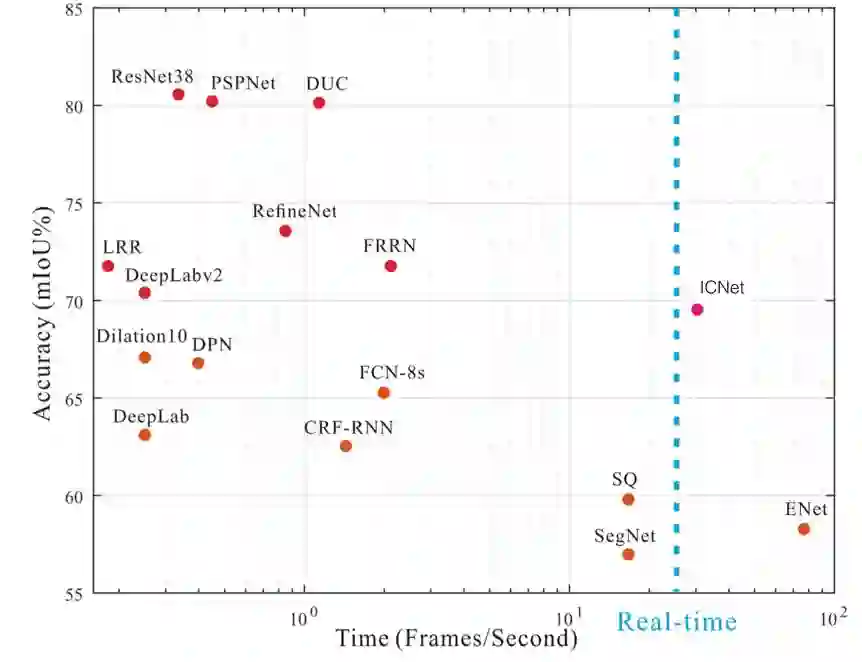目前很多主流的分割模型准确率都比较高,但是帧率会比较低。而无人驾驶的应用场景中模型必须实时,尤其是高速场景下,对模型的速度要求更高。目前美团使用的是改进版的 ICNet,既保证了模型的运行速度,又保证了模型的准确率。下图是一些经典分割模型的时间和准确率对比图: