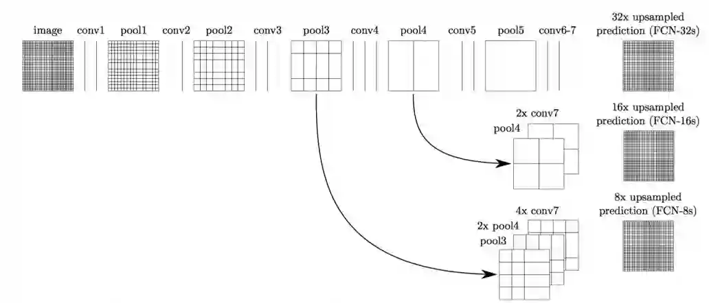 在无人驾驶中应用比较多的是语义分割。例如路面分割、人行横道分割等等。语义分割比较早期和经典的模型是 FCN[。FCN 有几个比较经典的改进,首先是用全卷积层替换了全连接层,其次是卷积之后的小分辨率 Feature Map 经过上层采样,再得到原分辨率大小的结果,最后 FCN 使用了跨层连接的方式。跨层连接可以将高层的语义特征和底层的位置特征较好地结合在一起,使得分割的结果更为准确。FCN 结构图如下所示: