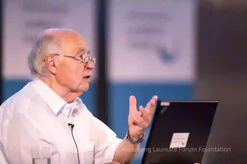 迈克尔·阿蒂亚爵士在论坛现场讲述证明过程。 图/ Heidelberg Laureate Forum Foundation