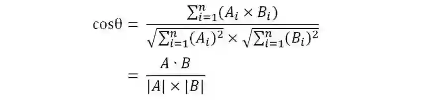 数学家已经证明,余弦的这种计算方法对n维向量也成立。假定A和B是两个n维向量,A是 [A1, A2, ..., An] ,B是 [B1, B2, ..., Bn] ,则A与B的夹角θ的余弦等于: