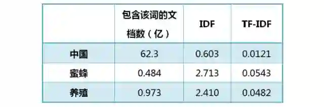 还是以《中国的蜜蜂养殖》为例,假定该文长度为1000个词,"中国"、"蜜蜂"、"养殖"各出现20次,则这三个词的"词频"(TF)都为0.02。然后,搜索Google发现,包含"的"字的网页共有250亿张,假定这就是中文网页总数。包含"中国"的网页共有62.3亿张,包含"蜜蜂"的网页为0.484亿张,包含"养殖"的网页为0.973亿张。则它们的逆文档频率(IDF)和TF-IDF如下: