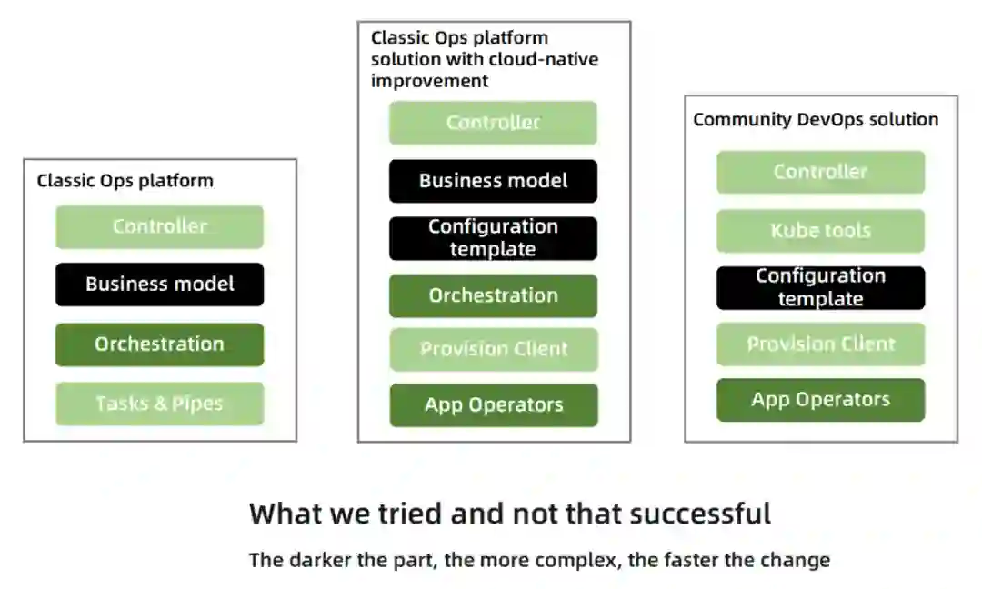 在规模化交付运维领域,经典运维平台试图在统一的黑盒平台产品中,以内置的统一模型、编排、provision 技术来应对全量业务场景。这样可以快速启动,并在小范围内奏效,但随着不同业务主体采用率的提升会引入差异化需求,并随着持续变化的平台技术逐渐进入疲态。