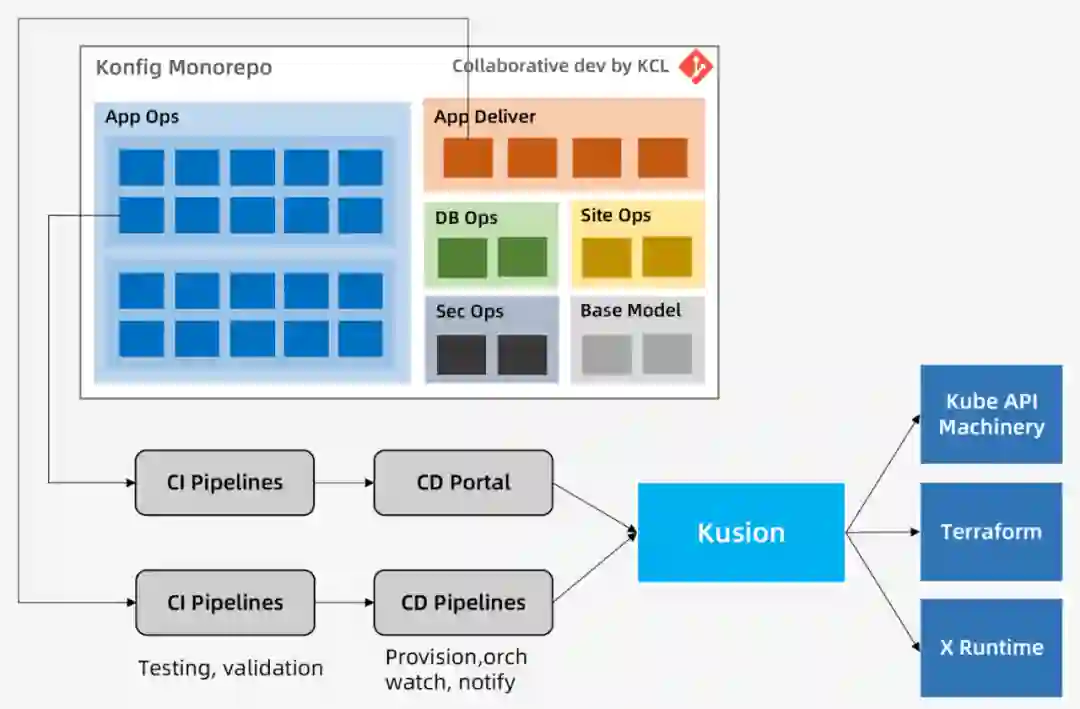 Konfig monorepo 提供了分治的、可组合的工程结构设计、代码组织、建模方式、工作流程定义和 provision 技术选择支持,同时又以一致的研发模式和工作流承载了可扩展的业务需求。这样客户端的工作方式在保证灵活性、可扩展性、可移植性的同时也降低了对服务端扩展机制,如 Kubernetes API Machinery,持续增长的压力。