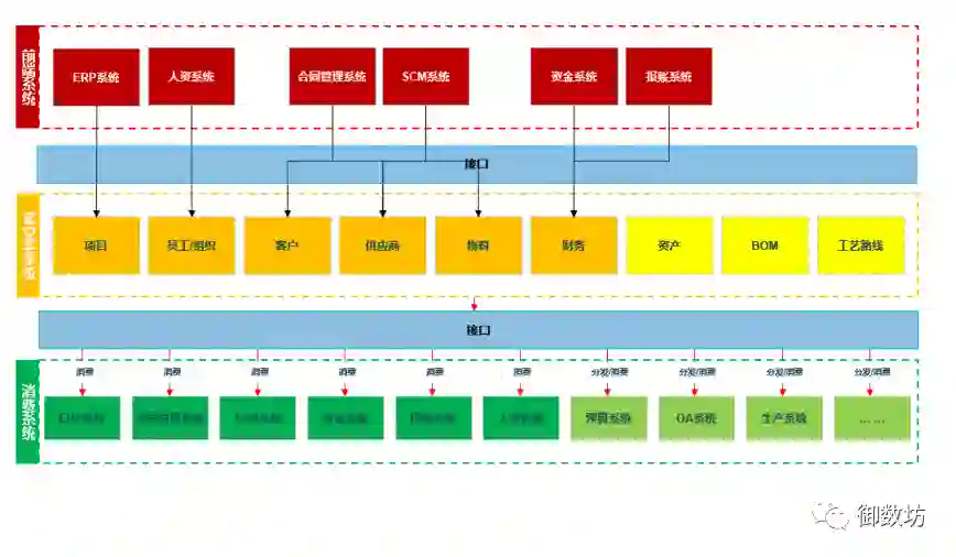 主数据分布于各个系统中,在此可将主数据分布的系统分为两大类:前端系统与消费系统。前端系统是主数据生成的系统,而消费系统则是主数据使用系统。主数据管理平台便是连接前端系统与消费系统的桥梁。所有系统间的对接需要通过接口进行集成,SOA、Webservice、DBlink、API等系统对接方式可供选择。